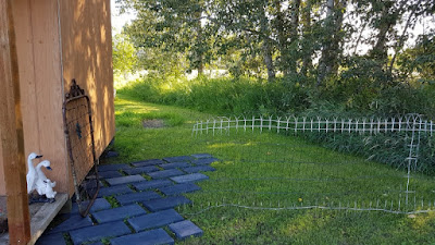 The wishing well is still a work in progress. We fish frogs out of it on a regular basis. But it has also become apparent that driving over the water line is not the best idea so the wire fence for my 'cottage' on the southwest end of the back yard needed reconfiguring.