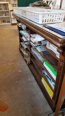 And as I am sorting papers I will be putting mixed media papers in the back of the long counter these bookcases face. Each grand student has two shelves and I have two. Moving all the journaling stuff to the desk leaves four shelves for mixed media projects. This old store counter was a bear to get moved from the farm to the new hobby room. The top is leather so we put glass on top. It really is invaluable. I might need another day with my little artists to sort through this. Maybe they can be persuaded to part with some that are less precious!!!